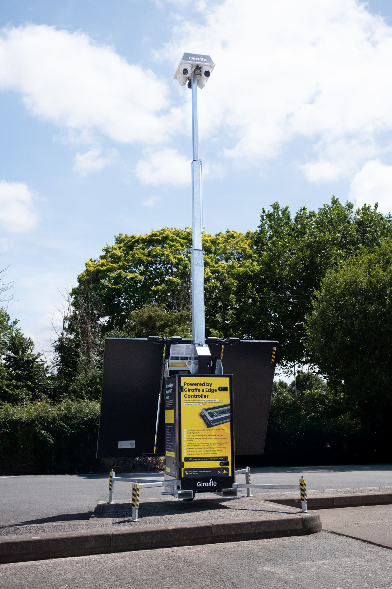 The Giraffe CCTV Tower (solar or mains powered, lithium batteries as standard, fuel cell as an option) is built around our own Edge Controller and powered by the Giraffe software platform.